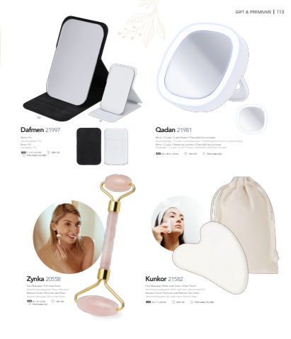 GIFT & PREMIUMS I 113Dafmen 2199701027 %u00d7 11 %u00d7 0.7 cm 200 / 50 Print Code: C(1), N(8)Qadan 219818.5 %u00d7 8.5 %u00d7 1.8 cm 100 / 25 Print Code: C(4)Zynka 205586 %u00d7 14 %u00d7 4 cm 100 / 50 Print Code: C(1)Kunkor 2158210 %u00d7 7 %u00d7 0.6 cm 200 / 50 Print Code: F(1), N(8)Face Massager. White Jade Stone. Cotton Pouch.Gesichtsmassageger%u00e4t. Wei%u00df Jade Stein. Baumwolle Etui.Masseur Facial. Pierre de Jade Blanche. %u00c9tui Coton.Gezichts Massager. Wit Jade Steen. Katoen Zakje.Face Massager. Pink Jade Stone.Gesichtsmassageger%u00e4t. Rosa Jade Stein.Masseur Facial. Pierre de Jade Rose.Gezichts Massager. Roze Jade Steen.Mirror. 12 Leds. 2 Light Modes. 3 Piles AAA Non Included.Taschenspiegel. 12 Leds. 2 Lichtpositionen. 3 AAA Batterien Nicht im Lieferumfang.Miroir. 12 Leds. 2 Modes de Lumi%u00e8re. 3 Piles AAA Non Incluses.Zakspiegel. 12 Leds. 2 Licht Posities. 3 Batterijen AAA Niet Inclusief.Mirror. PU.Taschenspiegel. PU.Miroir. PU.Zakspiegel. PU.
