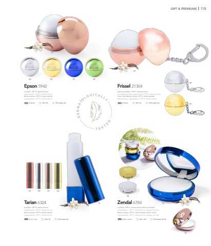 09 19 042223220923GIFT & PREMIUMS I 115Frissel 21304%u00d8 3.8 cm 500 / 50 Print Code: C(1)Epson 5942%u00d8 3.8 cm 500 / 50 Print Code: C(1)Tarian 632403 091922 23%u00d8 1.9 %u00d7 7 cm 500 / 25 Print Code: C(1)Zendal 678409192223%u00d8 4.8 %u00d7 1.6 cm 500 / 100 Print Code: C(1), WLip Balm. SPF15. Vanilla Aroma. Mirror Included.Lippenbalsam. SPF15. Vanille Aroma. Spiegel Inklusive.Baume L%u00e8vres. SPF15. Ar%u00f4me Vanille. Miroir Inclus.Lippenbalsem. SPF15. Vanille Aroma. Spiegel Inclusief.Lip Balm. SPF15. Vanilla Aroma.Lippenbalsam. SPF15. Vanille Aroma.Baume L%u00e8vres. SPF15. Ar%u00f4me Vanille.Lippenbalsem. SPF15. Vanille Aroma.Lip Balm. SPF15. Vanilla Aroma.Lippenbalsam. SPF15. Vanille Aroma.Baume L%u00e8vres. SPF15. Ar%u00f4me Vanille.Lippenbalsem. SPF15. Vanille Aroma.Keyring Lip Balm. SPF15. Vanilla Aroma.Schl%u00fcsselanh%u00e4nger Lippenbalsam. SPF15. Vanille Aroma.Porte-Cl%u00e9s Baume L%u00e8vres. SPF15. Ar%u00f4me Vanille.Sleutelhanger Lippenbalsem. SPF15. Vanille Aroma.