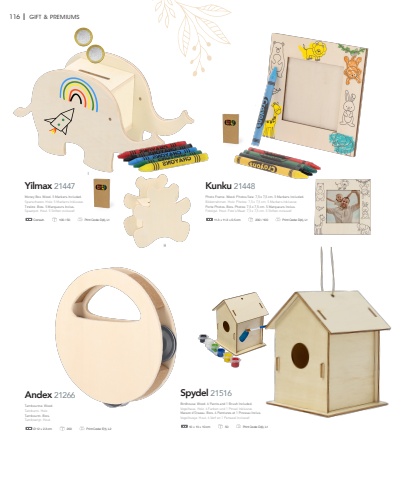 I116 I GIFT & PREMIUMSYilmax 21447HConsult. 100 / 50 Print Code: D(4), L1Kunku 2144811.3 %u00d7 11.3 %u00d7 0.5 cm 200 / 100 Print Code: D(4), L1Andex 21266%u00d8 12 %u00d7 2.3 cm 200 Print Code: E(1), L2Spydel 2151610 %u00d7 13 %u00d7 10 cm 50 Print Code: D(4), L1Birdhouse. Wood. 6 Paints and 1 Brush Included.Vogelhaus. Holz. 6 Farben und 1 Pinsel Inklusive.Maison d%u2019Oiseau. Bois. 6 Peintures et 1 Pinceau Inclus.Vogelhuisje. Hout. 6 Verf en 1 Penseel Inclusief.Tambourine. Wood.Tamburin. Holz.Tambourin. Bois.Tamboerijn. Hout.Photo Frame. Wood. Photos Size: 7,5 x 7,5 cm. 5 Markers Included.Bilderrahmen. Holz. Photos: 7,5 x 7,5 cm. 5 Markers Inklusive.Porte Photos. Bois. Photos: 7,5 x 7,5 cm. 5 Marqueurs Inclus.Fotolijst. Hout. Foto%u2019s Maat: 7,5 x 7,5 cm. 5 Stiften inclusief.Money Box. Wood. 5 Markers Included.Sparschwein. Holz. 5 Markers Inklusive.Tirelire. Bois. 5 Marqueurs Inclus.Spaarpot. Hout. 5 Stiften inclusief.