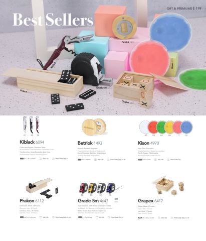 GIFT & PREMIUMS I 119Kiblack 609401 02 202.1 %u00d7 12 %u00d7 1.3 cm 200 / 10 Print Code: D(4), L1Betriok 1493%u00d8 6 %u00d7 1.1 cm 500 / 50 Print Code: C(4), L1, WKison 497003 04 05 11 19%u00d8 10 %u00d7 1 cm 150 / 50 Print Code: F(1)Prakon 611214.7 %u00d7 5 %u00d7 3.1 cm 100 / 50 Print Code: D(2), L2, WGrade 5m 4643 5MMETERS010103 05 197 %u00d7 7 %u00d7 3.5 cm 50 / 25 Print Code: E(1), VGrapex 64177.3 %u00d7 3.1 %u00d7 7.3 cm 200 / 50 Print Code: D(2), L1, WGame. Wood. 9 Pieces.Spiel. Holz. 9 St%u00fcck.Jeu. Bois. 9 Pi%u00e8ces.Spel. Hout. 9 Stuks.Tape Measure. With Brake and Clip Included.Ma%u00dfband. Mit Bremse und G%u00fcrtelclip Inklusive.M%u00e8tre Grade. Avec Frein et Clip Inclus.Meetlint. Met Rem en Clip Inclusief.Dominoes. Wood. 28 Pieces.Domino. Holz. 28 St%u00fcck.Dominos. Bois. 28 Pi%u00e8ces.Domino. Hout. 28 Stuks.Heat Pack. Reusable.Taschenw%u00e4rmer. Wiederverwendbar.Patch Chaleur. R%u00e9utilisable.Warmte Pakket. Herbruikbaar.Opener. Bamboo. Magnetic.Flaschen%u00f6ffner. Bambus. Magnetisch.Ouvre Bouteille. Bambou. Magn%u00e9tique.Opener. Bamboe. Magnetisch.Corkscrew Opener. Stainless Steel.Korkenzieher Flaschen%u00f6ffner. Rostfreier Stahl.Tire-Bouchon Ouvre Bouteille. Acier Inox.Kurketrekker Opener. Roestvrij Staal.