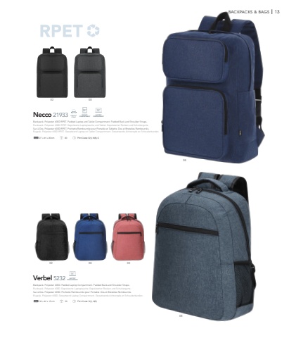 BACKPACKS & BAGS I 13Verbel 523202 06 0308LAPTOPCOMPARTMENT15%u201dNecco 21933 TROLLEY STRAP020608TABLET COMPARTMENT10%u201dLAPTOPCOMPARTMENT15%u201d27 %u00d7 41 %u00d7 20 cm 30 Print Code: G(1), N(8), OBackpack. Polyester 600D RPET. Padded Laptop and Tablet Compartment. Padded Back and Shoulder Straps.Rucksack. Polyester 600D RPET. Gepolsterte Laptoptasche und Tablet. Gepolsterter R%u00fccken und Schultergurte.Sac %u00e0 Dos. Polyester 600D RPET. Pochette Rembourr%u00e9e pour Portable et Tablette. Dos et Bretelles Rembourr%u00e9s.Rugzak. Polyester 600D RPET. Gewatteerd Laptop en Tablet Compartiment. Gewatteerde Achterzijde en Schouderbanden.Backpack. Polyester 600D. Padded Laptop Compartment. Padded Back and Shoulder Straps.Rucksack. Polyester 600D. Gepolsterte Laptoptasche. Gepolsterter R%u00fccken und Schultergurte.Sac %u00e0 Dos. Polyester 600D. Pochette Rembourr%u00e9e pour Portable. Dos et Bretelles Rembourr%u00e9s.Rugzak. Polyester 600D. Gewatteerd Laptop Compartiment. Gewatteerde Achterzijde en Schouderbanden.