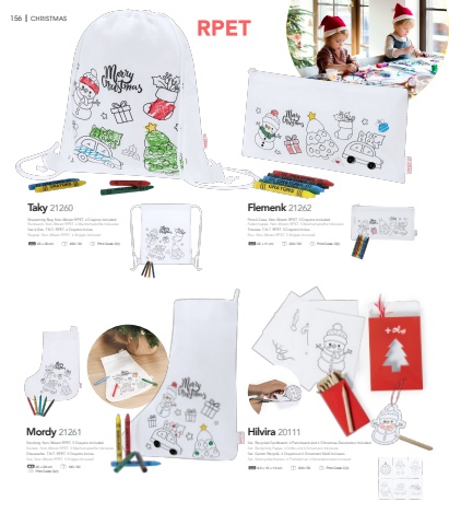 156 I CHRISTMASHilvira 201119.2 %u00d7 13 %u00d7 1.5 cm 200 / 50 Print Code: C(1)Taky 2126025 %u00d7 30 cm 200 / 50 Print Code: G(1)Mordy 2126120 %u00d7 29 cm 100 / 50 Print Code: G(1)Flemenk 2126222 %u00d7 11 cm 200 / 50 Print Code: G(1)Pencil Case. Non-Woven RPET. 5 Crayons Included.Federmappe. Non-Woven RPET. 5 Wachsmalstifte Inklusive.Trousse. T.N.T. RPET. 5 Crayons Inclus.Etui. Non-Woven RPET. 5 Krijtjes Inclusief.Stocking. Non-Woven RPET. 5 Crayons Included.Socken. Non-Woven RPET. 5 Wachsmalstifte Inklusive.Chaussette. T.N.T. RPET. 5 Crayons Inclus.Sok. Non-Woven RPET. 5 Krijtjes Inclusief.Drawstring Bag. Non-Woven RPET. 4 Crayons Included.Rucksack. Non-Woven RPET. 4 Wachsmalstifte Inklusive.Sac %u00e0 Dos. T.N.T. RPET. 4 Crayons Inclus.Rugzak. Non-Woven RPET. 4 Krijtjes Inclusief.Set. Recycled Cardboard. 6 Pencilsand and 6 Christmas Decoration Included.Set. Reclycling Pappe. 6 Stifte und 6 Ornament Inklusive.Set. Carton Recycl%u00e9. 6 Crayons et 6 Ornement No%u00ebl Incluses.Set. Gerecycled Karton. 6 Potloden en 6 Kerstdecoratie Inclusief.