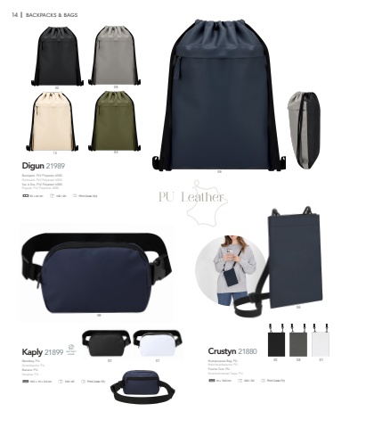 14 I BACKPACKS & BAGSDigun 21989020406081333 %u00d7 42 cm 100 / 20 Print Code: G(1)Kaply 21899 ANTI THEFTPOCKET02 010619.5 %u00d7 13 %u00d7 5.5 cm 100 / 25 Print Code: F(1)Crustyn 2188002 01060814 %u00d7 19.5 cm 200 / 50 Print Code: F(1)Multipurpose Bag. PU.Mehrzwecktasche. PU.Fourre-Tout. PU.Multifunctioneel Tasje. PU.Waistbag. PU.G%u00fcrteltasche. PU.Banane. PU.Heuptas. PU.Backpack. PU/ Polyester 600D.Rucksack. PU/ Polyester 600D.Sac %u00e0 Dos. PU/ Polyester 600D.Rugzak. PU/ Polyester 600D.