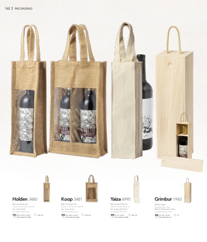 Holden 348010.5 %u00d7 35.5 %u00d7 10 cm 150 / 25 Print Code: G(1), N(8)Koop 348120 %u00d7 34.5 %u00d7 10 cm 100 / 25 Print Code: G(1), N(8)Yaiza 69908 %u00d7 31 %u00d7 8 cm 200 / 20 Print Code: F(1), N(8)Grimbur 194310 %u00d7 35 %u00d7 10 cm 15 Print Code: E(1), L2162 I PACKAGINGGift Box. Wood.Geschenk-Box. Holz.Bo%u00eete de Pr%u00e9sentation. Bois.Geschenkendoos. Hout.Bag. Canvas 220 g/ m2.Tasche. Canvas 220 g/ m2.Sac. Canvas 220 g/ m2.Tas. Canvas 220 g/ m2.Bag. Laminated Jute.Tasche. Laminiertes Jutestoff.Sac. Jute Lamin%u00e9.Tas. Gelamineerd Jute.Bag. Laminated Jute.Tasche. Laminiertes Jutestoff.Sac. Jute Lamin%u00e9.Tas. Gelamineerd Jute.