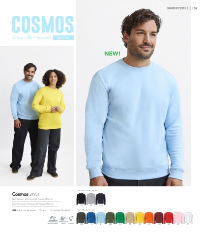 280 GSMWINTER TEXTILE I 169Cosmos 21951LIGHTWEIGHT &WARM GARMENTREMOVABLELABEL UNISEXAdult Sweatshirt. 60% Cotton/ 40% Polyester 280 g/ m2.Erwachsene Sweatshirt. 60% Baumwolle/ 40% Polyester 280 g/ m2.Sweat-Shirt Adulte. 60% Coton/ 40% Polyester 280 g/ m2.Volwassene Sweatshirt. 60% Katoen/ 40% Polyester 280 g/ m2.