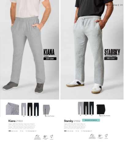 BRUSHED INTERIOR225 GSM 280 280 GSMWINTER TEXTILE I 17108 02 333 08 02 333LIGHTWEIGHT &WARM GARMENTREMOVABLELABEL LIGHTWEIGHT &WARM GARMENTREMOVABLELABELKiana 21833S, M, L, XL, XXL 40 Print Code: N(8), O, PStarsky 21832S, M, L, XL, XXL 30 Print Code: N(8), O, PUNISEX UNISEXJoggers. 100% Cotton Ring Spun, Single Jersey 225 g/ m2.Hose. 100% Baumwolle Ring Spun, Single Jersey 225 g/ m2.Pantalon. 100% Coton Ring Spun, Single Jersey 225 g/ m2.Broek. 100% Katoen Ring Spun, Single Jersey 225 g/ m2.Joggers. 60% Cotton/ 40% Polyester 280 g/ m2.Hose. 60% Baumwolle/ 40% Polyester 280 g/ m2.Pantalon. 60% Coton/ 40% Polyester 280 g/ m2.Broek. 60% Katoen/ 40% Polyester 280 g/ m2.