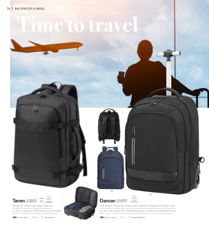 16 I BACKPACKS & BAGSTanen 20885 TROLLEY STRAP LAPTOPCOMPARTMENT17%u201d33 %u00d7 48 %u00d7 16 cm 10 Print Code: J(1)Dancan 208950206LAPTOPCOMPARTMENT15%u201d33.5 %u00d7 51 %u00d7 21 cm 4 Print Code: J(8), L2Trolley Backpack. Polyester 300D. Padded Laptop Compartment. Padded Back and Shoulder Straps.Trolley Rucksack. Polyester 300D. Gepolsterte Laptoptasche. Gepolsterter R%u00fccken und Schultergurte.Sac %u00e0 Dos Trolley. Polyester 300D. Pochette Rembourr%u00e9e pour Portable. Dos et Bretelles Rembourr%u00e9s.Trolley Rugzak. Polyester 300D. Gewatteerd Laptop. Gewatteerde Achterzijde en Schouderbanden.Backpack. PU. Padded. Padded Laptop Compartment.Rucksack. PU. Gepolstert. Gepolsterte Laptoptasche.Sac %u00e0 Dos. PU. Rembourr%u00e9. Pochette Rembourr%u00e9e pour Portable.Rugzak. PU. Gewatteerd. Gewatteerd Laptop Compartiment.