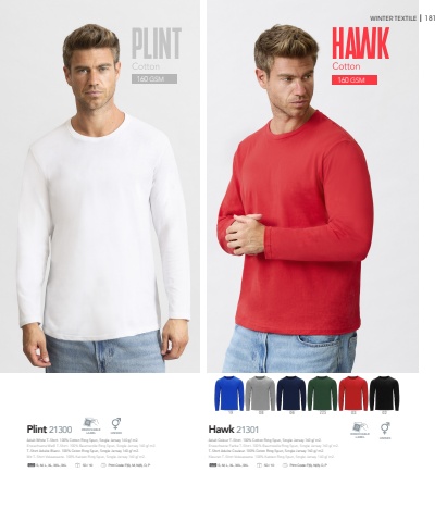 160 GSM 160 GSMWINTER TEXTILE I 181Plint 21300S, M, L, XL, XXL, 3XL 50 / 10 Print Code: F(6), M, N(8), O, PHawk 2130108 06S, M, L, XL, XXL, 3XL 50 / 10 Print Code: F(6), N(8), O, P03 02REMOVABLELABEL REMOVABLELABELUNISEXUNISEX Adult Colour T-Shirt. 100% Cotton Ring Spun, Single Jersey 160 g/ m2.Erwachsene Farbe T-Shirt. 100% Baumwolle Ring Spun, Single Jersey 160 g/ m2.T-Shirt Adulte Couleur. 100% Coton Ring Spun, Single Jersey 160 g/ m2.Kleuren T-Shirt Volwassene. 100% Katoen Ring Spun, Single Jersey 160 g/ m2.Adult White T-Shirt. 100% Cotton Ring Spun, Single Jersey 160 g/ m2.Erwachsene Wei%u00df T-Shirt. 100% Baumwolle Ring Spun, Single Jersey 160 g/ m2.T-Shirt Adulte Blanc. 100% Coton Ring Spun, Single Jersey 160 g/ m2.Wit T-Shirt Volwassene. 100% Katoen Ring Spun, Single Jersey 160 g/ m2.