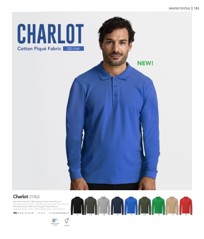220 GSMWINTER TEXTILE I 183REMOVABLELABEL UNISEXCharlot 21962XS, S, M, L, XL, XXL, 3XL 25 / 5 Print Code: F(6), N(8), O, PAdult Colour Polo Shirt. 100% Ring Spun Cotton, Piqu%u00e9 220 g/ m2.Erwachsene Farbe Polo-Shirt. 100% Ring Spun Baumwolle, Piqu%u00e9 220 g/ m2.Polo Adulte Couleur. 100% Coton Ring Spun, Piqu%u00e9 220 g/ m2.Volwassene Kleuren T-Shirt. 100% Ring Spun Katoen, Piqu%u00e9 220 g/ m2.