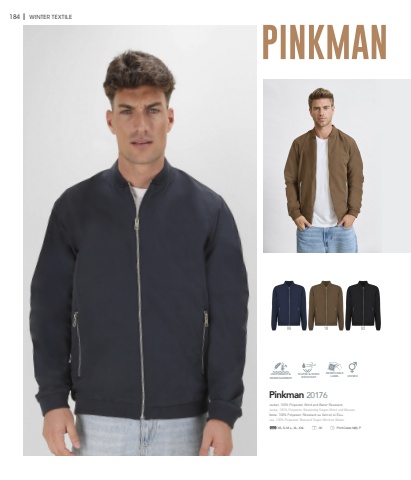 184 I WINTER TEXTILEPinkman 20176LIGHTWEIGHT &WARM GARMENTWATER & WINDRESISTANTREMOVABLELABELXS, S, M, L, XL, XXL 30 Print Code: N(8), PUNISEXJacket. 100% Polyester. Wind and Water Resistant.Jacke. 100% Polyester. Best%u00e4ndig Gegen Wind und Wasser.Veste. 100% Polyester. R%u00e9sistant au Vent et %u00e0 l%u2019Eau.Jas. 100% Polyester. Bestand Tegen Wind en Water.