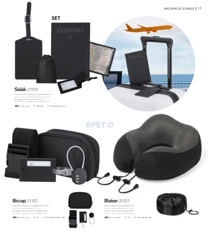 SETBACKPACKS & BAGS I 17Sislak 2199213 %u00d7 19 %u00d7 1 cm 200 / 100 Print Code: E(1), F(1), L1Biccap 2150716.5 %u00d7 11.5 %u00d7 5 cm 50 Print Code: F(1), E(4), L1, N(8)Blaiser 2035124.5 %u00d7 12 %u00d7 25 cm 20 Print Code: G(1), N(8)Pillow. Polyester. Polyester RPET Pouch.Kissen. Polyester. Polyester RPET Etui.Coussin. Polyester. %u00c9tui Polyester RPET.Kussen. Polyester. Polyester RPET Zakje.Travel Set. 3 Accessories. Polyester RPET Pouch.Reise Set. 3 Teile. Polyester RPET Etui.Set Voyage. 3 Accessoires. %u00c9tui Polyester RPET.Reis Set. 3 Accessoires. Polyester RPET Zakje.Travel Set. PU. 2 Accessories. Non-Woven Pouch.Reise Set. PU. 2 Teile. Non-Woven Etui Inklusive.Set Voyage. PU. 2 Accessoires. %u00c9tui T.N.T..Reis Set. PU. 2 Accessoires. Non-Woven Zakje.