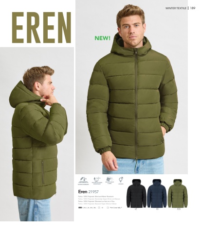 WINTER TEXTILE I 189Eren 21957LIGHTWEIGHT &WARM GARMENTWATER & WINDRESISTANTREMOVABLELABEL UNISEXParka. 100% Polyester. Wind and Water Resistant.Parka. 100% Polyester. Best%u00e4ndig Gegen Wind und Wasser.Parka. 100% Polyester. R%u00e9sistant au Vent et %u00e0 l%u2019Eau.Parka. 100% Polyester. Bestand Tegen Wind en Water.