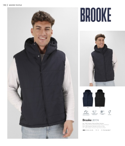 190 I WINTER TEXTILEBrooke 2017406 02LIGHTWEIGHT &WARM GARMENTWATER & WINDRESISTANTREMOVABLELABEL UNISEXXS, S, M, L, XL, XXL 15 Print Code: N(8), PVest. 100% Polyester. Wind and Water Resistant.Weste. 100% Polyester. Best%u00e4ndig Gegen Wind und Wasser.Gilet. 100% Polyester. R%u00e9sistant au Vent et %u00e0 l%u2019Eau.Vest. 100% Polyester. Bestand Tegen Wind en Water.