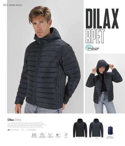 POUCH INCLUDED192 I WINTER TEXTILEDilax 21414RPET FABRICLIGHTWEIGHT &WARM GARMENT WATER & WINDRESISTANTREMOVABLELABEL UNISEXS, M, L, XL, XXL, 3XL 15 Print Code: N(8), P02 06Jacket. 100% Polyester RPET. Wind and Water Resistant. Polyester RPET Pouch.Jacke. 100% Polyester RPET. Best%u00e4ndig Gegen Wind und Wasser. Polyester RPET Etui.Veste. 100% Polyester RPET. R%u00e9sistant au Vent et %u00e0 l%u2019Eau. %u00c9tui Polyester RPET.Jas. 100% Polyester RPET. Bestand Tegen Wind en Water. Polyester RPET Zakje.