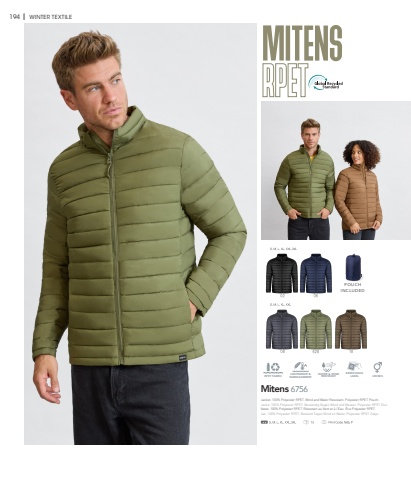 POUCH INCLUDED194 I WINTER TEXTILEMitens 6756RPET FABRICLIGHTWEIGHT &WARM GARMENTWATER & WINDRESISTANTREMOVABLELABEL UNISEXJacket. 100% Polyester RPET. Wind and Water Resistant. Polyester RPET Pouch.Jacke. 100% Polyester RPET. Best%u00e4ndig Gegen Wind und Wasser. Polyester RPET Etui.Veste. 100% Polyester RPET. R%u00e9sistant au Vent et %u00e0 l%u2019Eau. %u00c9tui Polyester RPET.Jas. 100% Polyester RPET. Bestand Tegen Wind en Water. Polyester RPET Zakje.