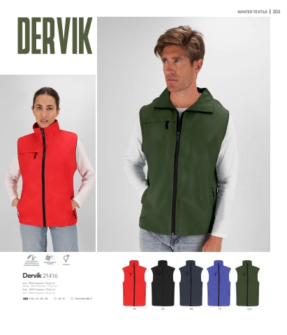 WINTER TEXTILE I 203Dervik 21416LIGHTWEIGHT &WARM GARMENTREMOVABLELABEL UNISEXS, M, L, XL, XXL, 3XL 50 / 10 Print Code: N(8), P03 02 06 19Vest. 100% Polyester 120 g/ m2.Weste. 100% Polyester 120 g/ m2.Gilet. 100% Polyester 120 g/ m2.Vest. 100% Polyester 120 g/ m2.