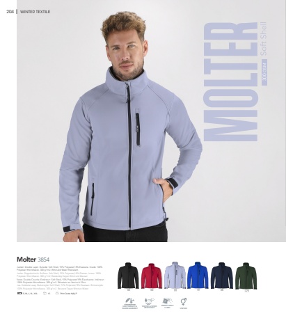 300 GSM204 I WINTER TEXTILEMolter 3854LIGHTWEIGHT &WARM GARMENTWATER & WINDRESISTANTREMOVABLELABEL UNISEXS, M, L, XL, XXL 15 Print Code: N(8), P02 03 19 06Jacket. Double Layer. Outside: Soft Shell, 92% Polyester/ 8% Elastane. Inside: 100% Polyester Microfleece. 300 g/ m2. Wind and Water Resistant.Jacke. Doppelschicht. %u00c4u%u00dfere: Soft Shell, 92% Polyester/ 8% Elastan. Innen: 100% Polyester Microfleece. 300 g/ m2. Best%u00e4ndig Gegen Wind und Wasser.Veste. Double Couche. Ext%u00e9rieur: Soft Shell, 92% Polyester/ 8% %u00c9lasthanne. Int%u00e9rieur: 100% Polyester Microfleece. 300 g/ m2. R%u00e9sistant au Vent et %u00e0 l%u2019Eau.Jas. Dubbele Laag. Buitenzijde: Soft Shell, 92% Polyester/ 8% Elastaan. Binnenzijde: 100% Polyester Microfleece. 300 g/ m2. Bestand Tegen Wind en Water.