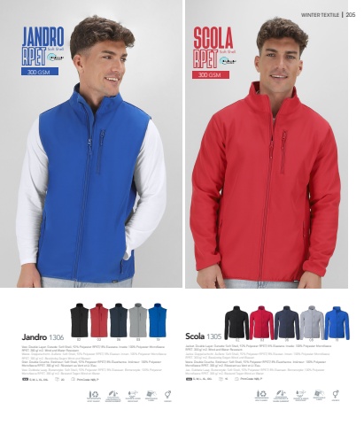 300 GSM 300 GSMWINTER TEXTILE I 205Scola 1305S, M, L, XL, XXL 15 Print Code: N(8), PJandro 1306RPET FABRICLIGHTWEIGHT &WARM GARMENTWATER & WINDRESISTANTREMOVABLELABEL UNISEX RPET FABRICLIGHTWEIGHT &WARM GARMENTWATER & WINDRESISTANTREMOVABLELABEL UNISEXS, M, L, XL, XXL 20 Print Code: N(8), PVest. Double Layer. Outside: Soft Shell, 92% Polyester RPET/ 8% Elastane. Inside: 100% Polyester Microfleece RPET. 300 g/ m2. Wind and Water Resistant.Weste. Doppelschicht. %u00c4u%u00dfere: Soft Shell, 92% Polyester RPET/ 8% Elastan. Innen: 100% Polyester Microfleece RPET. 300 g/ m2. Best%u00e4ndig Gegen Wind und Wasser.Gilet. Double Couche. Ext%u00e9rieur: Soft Shell, 92% Polyester RPET/ 8% %u00c9lasthanne. Int%u00e9rieur: 100% Polyester Microfleece RPET. 300 g/ m2. R%u00e9sistant au Vent et %u00e0 l%u2019Eau.Vest. Dubbele Laag. Buitenzijde: Soft Shell, 92% Polyester RPET/ 8% Elastaan. Binnenzijde: 100% Polyester Microfleece RPET. 300 g/ m2. Bestand Tegen Wind en Water.Jacket. Double Layer. Outside: Soft Shell, 92% Polyester RPET/ 8% Elastane. Inside: 100% Polyester Microfleece RPET. 300 g/ m2. Wind and Water Resistant.Jacke. Doppelschicht. %u00c4u%u00dfere: Soft Shell, 92% Polyester RPET/ 8% Elastan. Innen: 100% Polyester Microfleece RPET. 300 g/ m2. Best%u00e4ndig Gegen Wind und Wasser.Veste. Double Couche. Ext%u00e9rieur: Soft Shell, 92% Polyester RPET/ 8% %u00c9lasthanne. Int%u00e9rieur: 100% Polyester Microfleece RPET. 300 g/ m2. R%u00e9sistant au Vent et %u00e0 l%u2019Eau.Jas. Dubbele Laag. Buitenzijde: Soft Shell, 92% Polyester RPET/ 8% Elastaan. Binnenzijde: 100% Polyester Microfleece RPET. 300 g/ m2. Bestand Tegen Wind en Water.