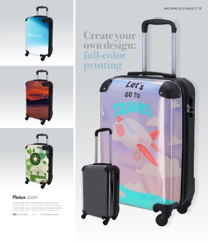 Create your own design: full-color printingBACKPACKS & BAGS I 19Pletux 2200935 %u00d7 22 %u00d7 56 cm 1 Print Code: J(1), L2, WTrolley. PC/ ABS. Rigid. 4 Rotating Wheels. Combination Lock.Trolley. PC/ ABS. Starre. 4 Drehende R%u00e4der. Sicherheitsverschluss.Trolley. PC/ ABS. Rigide. 4 Roues Tournantes. Fermeture S%u00e9curit%u00e9.Trolley. PC/ ABS. Hard. 4 Draaiende Wielen. Veiligheidssluiting.