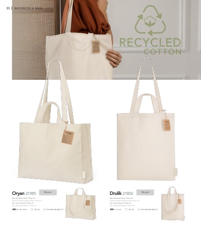 20 I BACKPACKS & BAGSOryan 21985 150 g/m250 %u00d7 36 %u00d7 12 cm 100 / 50 Print Code: F(6), N(8), O, PDrulik 21802 140 g/m237 %u00d7 41 cm 150 / 50 Print Code: F(6), N(8), O, PBag. Recycled Cotton 140 g/ m2.Tasche. Reclycling Baumwolle 140 g/ m2.Sac. Coton Recycl%u00e9 140 g/ m2.Tas. Gerecycled Katoen 140 g/ m2.Bag. Recycled Cotton 150 g/ m2.Tasche. Reclycling Baumwolle 150 g/ m2.Sac. Coton Recycl%u00e9 150 g/ m2.Tas. Gerecycled Katoen 150 g/ m2.