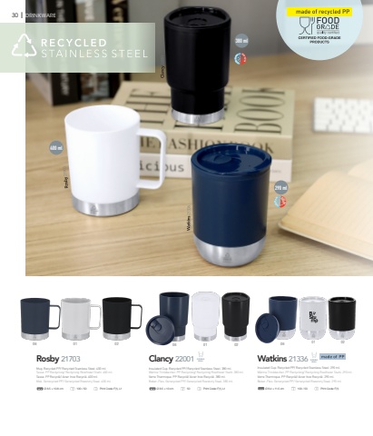 HOT 2HOC LD 4H30 I DRINKWAREClancy 22001 DOUBLE WALLHOT 2HOC LD 4H06 01 02380 ml%u00d8 8.5 %u00d7 13 cm 50 Print Code: F(1), L1Watkins 21336 DOUBLE WALLHOT 2HOC LD 4H01 02 06290 ml%u00d8 8.4 %u00d7 11.5 cm 100 / 50 Print Code: F(1)Rosby 2170306 01 02400 ml%u00d8 8.5 %u00d7 10.8 cm 100 / 50 Print Code: F(1), L1Mug. Recycled PP/ Recycled Stainless Steel. 400 ml.Tasse. PP Reclycling/ Reclycling Rostfreier Stahl. 400 ml.Tasse. PP Recycl%u00e9/ Acier Inox Recycl%u00e9. 400 ml.Mok. Gerecycled PP/ Gerecycled Roestvrij Staal. 400 ml.Insulated Cup. Recycled PP/ Recycled Stainless Steel. 290 ml.W%u00e4rme Trinkbecher. PP Reclycling/ Reclycling Rostfreier Stahl. 290 ml.Verre Thermique. PP Recycl%u00e9/ Acier Inox Recycl%u00e9. 290 ml.Beker-Fles. Gerecycled PP/ Gerecycled Roestvrij Staal. 290 ml.Insulated Cup. Recycled PP/ Recycled Stainless Steel. 380 ml.W%u00e4rme Trinkbecher. PP Reclycling/ Reclycling Rostfreier Stahl. 380 ml.Verre Thermique. PP Recycl%u00e9/ Acier Inox Recycl%u00e9. 380 ml.Beker-Fles. Gerecycled PP/ Gerecycled Roestvrij Staal. 380 ml.