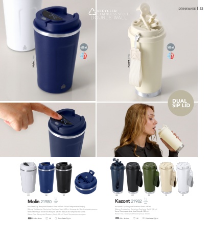 DRINKWARE I 33HOT 3HOC LD 6HMolin 21980 DOUBLE WALL01 06 02400 ml%u00d8 8.8 %u00d7 16 cm 30 Print Code: F(1), L1Kazont 21982 DOUBLE WALLHOT 3HOC LD 6H06 02 04 13 01500 ml%u00d8 9 %u00d7 18.8 cm 25 Print Code: F(1), L1Insulated Cup. Recycled Stainless Steel. 500 ml.W%u00e4rme Trinkbecher. Reclycling Rostfreier Stahl. 500 ml.Verre Thermique. Acier Inox Recycl%u00e9. 500 ml.Beker-Fles. Gerecycled Roestvrij Staal. 500 ml.Insulated Cup. Recycled Stainless Steel. 400 ml. Touch Temperature Display.W%u00e4rme Trinkbecher. Reclycling Rostfreier Stahl. 400 ml. Anzeige der Ber%u00fchrungstemperatur.Verre Thermique. Acier Inox Recycl%u00e9. 400 ml. Mesure de Temp%u00e9rature Tactile.Beker-Fles. Gerecycled Roestvrij Staal. 400 ml. Touch Temperatuurweergave.