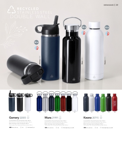 DRINKWARE I 3906 02 19 09 06 04 03 02 06 19 04 02 03Muns 21991 DOUBLE WALLHOT 6HOC LD 15H01 01 01%u00d8 7.2 %u00d7 22.7 cm 30 Print Code: F(1), L2, L3, WRKeono 20715 DOUBLE WALLDOUBLE WALLHOT 6HOC LD 15H%u00d8 7.2 %u00d7 22.7 cm 30 Print Code: F(4), L2, L3, WRGomery 22005HOT 6HOC LD 15H500 ml%u00d8 9.3 %u00d7 22.1 cm 20 Print Code: F(1), L1Insulated Bottle. Recycled Stainless Steel. 500 ml.W%u00e4rme Flasche. Reclycling Rostfreier Stahl. 500 ml.Bidon Thermique. Acier Inox Recycl%u00e9. 500 ml.Thermoskan-Fles. Gerecycled Roestvrij Staal. 500 ml.Insulated Bottle. Recycled Stainless Steel. 550 ml.W%u00e4rme Flasche. Reclycling Rostfreier Stahl. 550 ml.Bidon Thermique. Acier Inox Recycl%u00e9. 550 ml.Thermoskan-Fles. Gerecycled Roestvrij Staal. 550 ml.Insulated Bottle. Recycled Stainless Steel. 500 ml.W%u00e4rme Flasche. Reclycling Rostfreier Stahl. 500 ml.Bidon Thermique. Acier Inox Recycl%u00e9. 500 ml.Thermoskan-Fles. Gerecycled Roestvrij Staal. 500 ml.