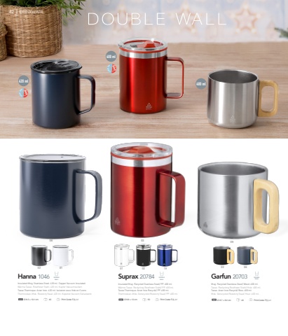 42 I DRINKWARESuprax 20784 DOUBLE WALLHOT 3HOC LD 6H01 020319400 ml%u00d8 8.8 %u00d7 12 cm 50 Print Code: F(1), L1Hanna 1046 DOUBLE WALLHOT 8HOC LD 24H02 0106420 ml%u00d8 8.5 %u00d7 10.1 cm 40 Print Code: F(1), L1Garfun 20703 DOUBLE WALL02 0609400 ml%u00d8 8.7 %u00d7 8.2 cm 40 Print Code: F(1), L1Mug. Recycled Stainless Steel/ Wood. 400 ml.Tasse. Reclycling Rostfreier Stahl/ Holz. 400 ml.Tasse. Acier Inox Recycl%u00e9/ Bois. 400 ml.Mok. Gerecycled Roestvrij Staal/ Hout. 400 ml.Insulated Mug. Stainless Steel. 420 ml. Copper Vacuum Insulated.W%u00e4rme Tasse. Rostfreier Stahl. 420 ml. Kupfer Vakuumisoliert.Tasse Thermique. Acier Inox. 420 ml. Isolation sous Vide en Cuivre.Thermoskan-Mok. Roestvrij Staal. 420 ml. Koperen Vacu%u00fcm Ge%u00efsoleerd.Insulated Mug. Recycled Stainless Steel/ PP. 400 ml.W%u00e4rme Tasse. Reclycling Rostfreier Stahl/ PP. 400 ml.Tasse Thermique. Acier Inox Recycl%u00e9/ PP. 400 ml.Thermoskan-Mok. Gerecycled Roestvrij Staal/ PP. 400 ml.