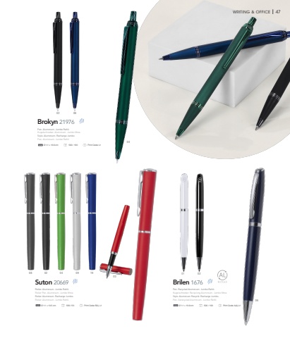 WRITING & OFFICE I 47Brokyn 21976020406%u00d8 1.1 %u00d7 13.6 cm 500 / 100 Print Code: L1Brilen 167601 0206%u00d8 1.1 %u00d7 13.9 cm 500 / 100 Print Code: A(4), L1Suton 20669020308 04 09 19%u00d8 1.1 %u00d7 13.5 cm 500 / 50 Print Code: B(1), L1Roller. Aluminium. Jumbo Refill.Roller Pen. Aluminium. Jumbo Mine.Roller. Aluminium. Recharge Jumbo.Roller. Aluminium. Jumbo Refill.Pen. Recycled Aluminium. Jumbo Refill.Kugelschreiber. Reclycling Aluminium. Jumbo Mine.Stylo. Aluminium Recycl%u00e9. Recharge Jumbo.Pen. Gerecycled Aluminium. Jumbo Refill.Pen. Aluminium. Jumbo Refill.Kugelschreiber. Aluminium. Jumbo Mine.Stylo. Aluminium. Recharge Jumbo.Pen. Aluminium. Jumbo Refill.