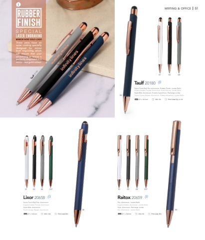 These pens have an outer coating specially designed for mirror laser engraving, which will ensure that your advertising or brand is perfectly engraved in a mirror rose gold colour.WRITING & OFFICE I 51Raitox 20659%u00d8 1 %u00d7 13.8 cm 500 / 50 Print Code: B(1)Lixor 2065801 010102 020206 060608 0808227 227%u00d8 1 %u00d7 14.5 cm 500 / 100 Print Code: B(1)Taulf 20180%u00d8 1 %u00d7 14.2 cm 500 / 50 Print Code: D(1), L1, WStylus Touch Ball Pen. Aluminium. Rubber Finish. Jumbo Refill.Kugelschreiber Pointer. Aluminium. Gummierung. Jumbo Mine.Stylet Bille. Aluminium. Finition Caoutchouc. Recharge Jumbo.Touch-Screen Balpen. Aluminium. Rubber Afwerking. Jumbo Refill.Stylus Touch Ball Pen. Aluminium.Kugelschreiber Pointer. Aluminium.Stylet Bille. Aluminium.Touch-Screen Balpen. Aluminium.Pen. Aluminium. Jumbo Refill.Kugelschreiber. Aluminium. Jumbo Mine.Stylo. Aluminium. Recharge Jumbo.Pen. Aluminium. Jumbo Refill.