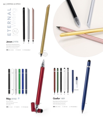 WRITING & OFFICE 52 IJevon 2197802 09 2223 %u00d8 0.8 %u00d7 14.8 cm 500 / 100 Print Code: B(4), L1May 2018202 010309 04 19 06%u00d8 1 %u00d7 14 cm 1000 / 50 Print Code: A(4)02 010603 04 08ERASERGosfor 1489%u00d8 0.9 %u00d7 14.3 cm 500 / 100 Print Code: B(4), L1Eternal Pencil Pen.Ewiger Bleistift Kugelschreiber.Stylo Crayon %u00c9ternel.Bleistift Pen.Eternal Pencil. Recycled Aluminium.Ewiger Bleistift. Reclycling Aluminium.Crayon %u00c9ternel. Aluminium Recycl%u00e9.Bleistift. Gerecycled Aluminium.Eternal Stylus Touch Pencil. Aluminium.Ewiger Bleistift Pointer. Aluminium.Stylet Crayon %u00c9ternel. Aluminium.Touch-Screen Bleistift. Aluminium.