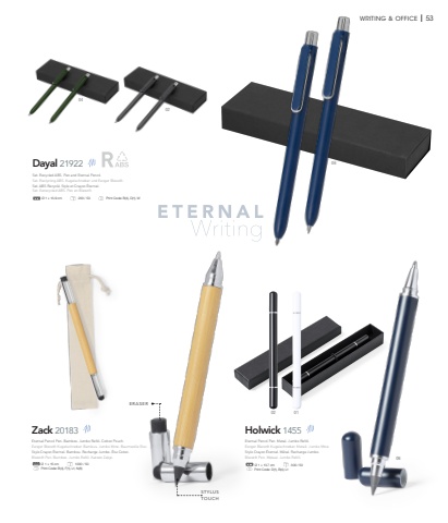 STYLUS TOUCHERASERWRITING & OFFICE I 53Dayal 21922020406%u00d8 1 %u00d7 13.9 cm 200 / 50 Print Code: B(4), D(1), WZack 20183%u00d8 1 %u00d7 15 cm 1000 / 50 Print Code: B(4), F(1), L1, N(8)Holwick 145502 0106%u00d8 1 %u00d7 13.7 cm 300 / 50 Print Code: D(1), B(4), L1Eternal Pencil Pen. Metal. Jumbo Refill.Ewiger Bleistift Kugelschreiber. Metall. Jumbo Mine.Stylo Crayon %u00c9ternel. M%u00e9tal. Recharge Jumbo.Bleistift Pen. Metaal. Jumbo Refill.Eternal Pencil Pen. Bamboo. Jumbo Refill. Cotton Pouch.Ewiger Bleistift Kugelschreiber. Bambus. Jumbo Mine. Baumwolle Etui.Stylo Crayon %u00c9ternel. Bambou. Recharge Jumbo. %u00c9tui Coton.Bleistift Pen. Bamboe. Jumbo Refill. Katoen Zakje.Set. Recycled ABS. Pen and Eternal Pencil.Set. Reclycling ABS. Kugelschreiber und Ewiger Bleistift.Set. ABS Recycl%u00e9. Stylo et Crayon %u00c9ternel.Set. Gerecycled ABS. Pen en Bleistift.