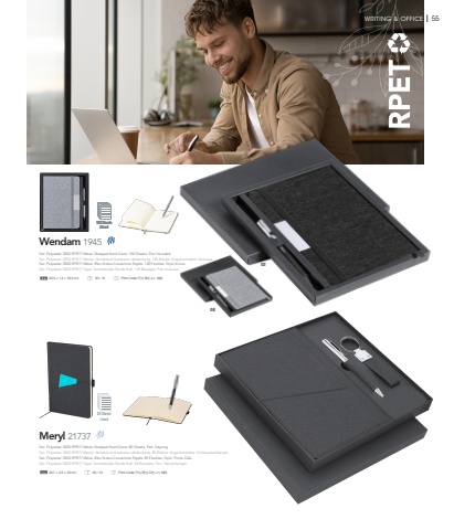 0802WRITING & OFFICE I 55Meryl 2173780 Sheets Lined22.7 %u00d7 2.5 %u00d7 22 cm 20 / 10 Print Code: F(1), B(1), D(1), L1, N(8)100 Sheets Lined02080208Set. Polyester 300D RPET/ Metal. Notepad Hard Cover. 100 Sheets. Pen Included.Set. Polyester 300D RPET/ Metall. Notizblock Hardcover-Abdeckung. 100 Bl%u00e4tter. Kugelschreiber Inklusive.Set. Polyester 300D RPET/ M%u00e9tal. Bloc Notes Couverture Rigide. 100 Feuilles. Stylo Inclus.Set. Polyester 300D RPET/ Staal. Notitieblokje Harde Kaft. 100 Blaadjes. Pen Inclusief.23.5 %u00d7 1.4 %u00d7 19.5 cm 30 / 15 Print Code: F(1), B(1), L1, N(8)Wendam 1945Set. Polyester 300D RPET/ Metal. Notepad Hard Cover. 80 Sheets. Pen. Keyring.Set. Polyester 300D RPET/ Metall. Notizblock Hardcover-Abdeckung. 80 Bl%u00e4tter. Kugelschreiber. Schl%u00fcsselanh%u00e4nger.Set. Polyester 300D RPET/ M%u00e9tal. Bloc Notes Couverture Rigide. 80 Feuilles. Stylo. Porte-Cl%u00e9s.Set. Polyester 300D RPET/ Staal. Notitieblokje Harde Kaft. 80 Blaadjes. Pen. Sleutelhanger.