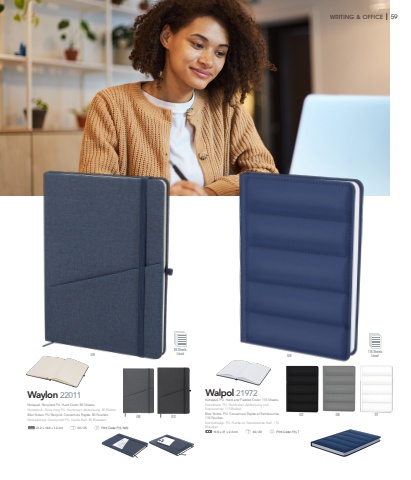 WRITING & OFFICE I 59Waylon 2201108 0280 Sheets Lined21.2 %u00d7 14.6 %u00d7 1.2 cm 50 / 25 Print Code: F(1), N(8)Walpol 2197202 010608110 Sheets Lined14.6 %u00d7 21 %u00d7 2.3 cm 40 / 20 Print Code: F(1), T06Notepad. PU. Hard and Padded Cover. 110 Sheets.Notizblock. PU. Hardcover-Abdeckung und Gepolsterter. 110 Bl%u00e4tter.Bloc Notes. PU. Couverture Rigide et Rembourr%u00e9e. 110 Feuilles.Notitieblokje. PU. Harde en Gewatteerde Kaft. 110 Blaadjes.Notepad. Recycled PU. Hard Cover. 80 Sheets.Notizblock. Reclycling PU. Hardcover-Abdeckung. 80 Bl%u00e4tter.Bloc Notes. PU Recycl%u00e9. Couverture Rigide. 80 Feuilles.Notitieblokje. Gerecycled PU. Harde Kaft. 80 Blaadjes.