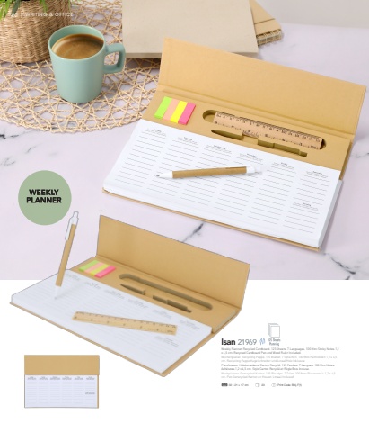 WRITING & OFFICE 62 IIsan 2196932 %u00d7 21 %u00d7 1.7 cm 20 Print Code: B(4), F(1)Weekly Planner. Recycled Cardboard. 125 Sheets. 7 Languages. 100 Mini Sticky Notes 1,2 x 4,5 cm. Recycled Cardboard Pen and Wood Ruler Included.Wochenplaner. Reclycling Pappe. 125 Bl%u00e4tter. 7 Sprachen. 100 Mini Haftnotizen 1,2 x 4,5 cm. Reclycling Pappe Kugelschreiber und Lineal Holz Inklusive.Planificateur Hebdomadaire. Carton Recycl%u00e9. 125 Feuilles. 7 Langues. 100 Mini Notes Adh%u00e9sives 1,2 x 4,5 cm. Stylo Carton Recycl%u00e9 et R%u00e8gle Bois Incluse.Weekplanner. Gerecycled Karton. 125 Blaadjes. 7 Talen. 100 Mini Plakmemo%u2019s 1,2 x 4,5 cm. Pen Gerecycled Karton en Houten Liniaal Inclusief.