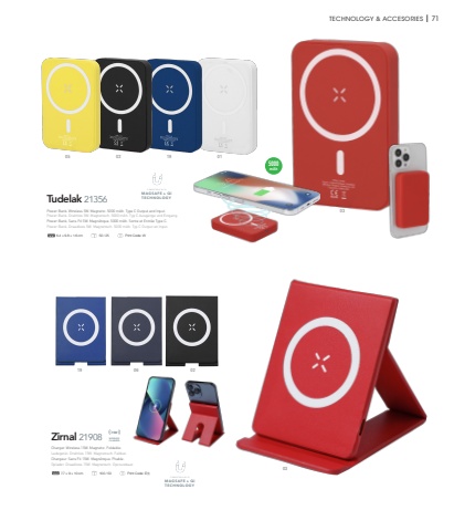 COMPATIBLE WITHMAGSAFE TECHNOLOGY& QiCOMPATIBLE WITHMAGSAFE TECHNOLOGY& QiTECHNOLOGY & ACCESORIES I 71Zirnal 21908 WIRELESSCHARGER15W7.7 %u00d7 9 %u00d7 10 cm 100 / 50 Print Code: E(1)Tudelak 2135602 010305 195000mAh6.4 %u00d7 9.8 %u00d7 1.6 cm 50 / 25 Print Code: W020319 06Power Bank. Wireless 5W. Magnetic. 5000 mAh. Type C Output and Input.Power Bank. Drahtlos 5W. Magnetisch. 5000 mAh. Typ C Ausg%u00e4nge und Eingang.Power Bank. Sans Fil 5W. Magn%u00e9tique. 5000 mAh. Sortie et Entr%u00e9e Type C.Power Bank. Draadloos 5W. Magnetisch. 5000 mAh. Typ C Output en Input.Charger. Wireless 15W. Magnetic. Foldable.Ladeger%u00e4t. Drahtlos 15W. Magnetisch. Faltbar.Chargeur. Sans Fil 15W. Magn%u00e9tique. Pliable.Oplader. Draadloos 15W. Magnetisch. Opvouwbaar.