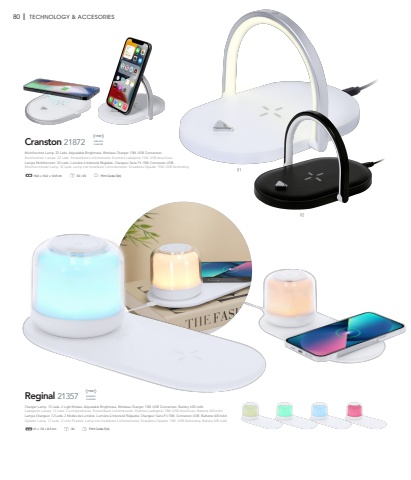 80 I TECHNOLOGY & ACCESORIESCranston 21872 WIRELESSCHARGER15W16.6 %u00d7 10.2 %u00d7 12.8 cm 50 / 25 Print Code: D(4)Reginal 21357 WIRELESSCHARGER15W21 %u00d7 7.9 %u00d7 9.5 cm 30 Print Code: E(4)Charger Lamp. 12 Leds. 2 Light Modes. Adjustable Brightness. Wireless Charger 15W. USB Connection. Battery 600 mAh.Ladeger%u00e4t Lampe. 12 Leds. 2 Lichtpositionen. Einstellbare Lichtintensit%u00e4t. Drahtlos Ladeger%u00e4t 15W. USB Anschluss. Batterie 600 mAh.Lampe Chargeur. 12 Leds. 2 Modes de Lumi%u00e8re. Lumi%u00e8re %u00e0 Intensit%u00e9 R%u00e9glable. Chargeur Sans Fil 15W. Connexion USB. Batterie 600 mAh.Oplader Lamp. 12 Leds. 2 Licht Posities. Lamp met Instelbare Lichtintensiteit. Draadloos Oplader 15W. USB Verbinding. Batterij 600 mAh.Multifunction Lamp. 32 Leds. Adjustable Brightness. Wireless Charger 15W. USB Connection.Multifunktion Lampe. 32 Leds. Einstellbare Lichtintensit%u00e4t. Drahtlos Ladeger%u00e4t 15W. USB Anschluss.Lampe Multifonction. 32 Leds. Lumi%u00e8re %u00e0 Intensit%u00e9 R%u00e9glable. Chargeur Sans Fil 15W. Connexion USB.Multifunctioneel Lamp. 32 Leds. Lamp met Instelbare Lichtintensiteit. Draadloos Oplader 15W. USB Verbinding.