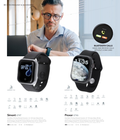APPCOMPATIBLE WITHANDROID & iOSAPPCOMPATIBLE WITHANDROID & iOS84 I TECHNOLOGY & ACCESORIESSimont 6747HEART RATEMONITORMESSAGE NOTIFYBLOOD PRESSURECALLS NOTIFYBLOOD OXYGEN MONITORREMOTE SHUTTERCALORIESCOUNTERALARMMULTISPORTSVIBRATIONSLEEP MONITORINGTIME & DATEAPP NOTIFYANTI-LOST25 %u00d7 3.6 %u00d7 1.3 cm 50 Print Code: I(1), L2Proxor 6746HEART RATEMONITORSTOPWATCHTIME & DATEBLOOD PRESSUREHANDS-FREE ANTI-LOSTBLOOD OXYGEN MONITORAPP NOTIFYTORCHCALORIESCOUNTERMESSAGE NOTIFYMUSIC PLAYERTACTILEWATCHREMOTE SHUTTERPHONE BOOKMULTISPORTSALARMSLEEP MONITORINGVIBRATIONSmart Watch. TPU Strap. Bluetooth Connection. 2,01%u201d IPS Screen. Battery 180 mAh.Intelligente Uhr. TPU Armband. Bluetooth Anschluss. 2,01%u201d IPS Screen. Batterie 160 mAh.Montre Intelligente. Bracelet TPU. Connexion Bluetooth. %u00c9cran IPS 2,01%u201d. Batterie 180 mAh.Smartwatch. TPU Band. Bluetooth Verbinding. 2,01%u201d IPS Scherm. Batterij 180 mAh.Smart Watch. TPU Strap. Bluetooth Connection. 1,44%u201d LCD Screen. Battery 50 mAh.Intelligente Uhr. TPU Armband. Bluetooth Anschluss. 1,44%u201d LCD Screen. Batterie 50 mAh.Montre Intelligente. Bracelet TPU. Connexion Bluetooth. %u00c9cran LCD 1,44%u201d. Batterie 50 mAh.Smartwatch. TPU Band. Bluetooth Verbinding. 1,44%u201d LCD Scherm. Batterij 50 mAh.