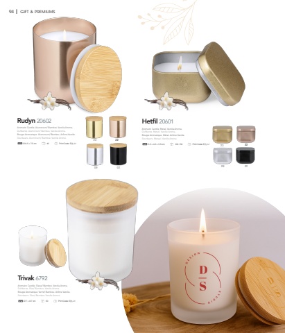 94 I GIFT & PREMIUMSRudyn 20602%u00d8 6.5 %u00d7 7.5 cm 40 Print Code: E(1), L1Hetfil 2060102 02 09 095.5 %u00d7 4.3 %u00d7 5.5 cm 100 / 50 Print Code: E(1), L1Trivak 6792%u00d8 7 %u00d7 8.7 cm 50 Print Code: E(1), L123232222Aromatic Candle. Glass/ Bamboo. Vanilla Aroma.Duftkerze. Glas/ Bambus. Vanille Aroma.Bougie Aromatique. Verre/ Bambou. Ar%u00f4me Vanille.Geurkaars. Glas/ Bamboe. Vanille Aroma.Aromatic Candle. Metal. Vanilla Aroma.Duftkerze. Metall. Vanille Aroma.Bougie Aromatique. M%u00e9tal. Ar%u00f4me Vanille.Geurkaars. Metaal. Vanille Aroma.Aromatic Candle. Aluminium/ Bamboo. Vanilla Aroma.Duftkerze. Aluminium/ Bambus. Vanille Aroma.Bougie Aromatique. Aluminium/ Bambou. Ar%u00f4me Vanille.Geurkaars. Aluminium/ Bamboe. Vanille Aroma.