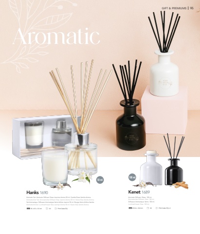 50 ml01 02GIFT & PREMIUMS I 95Hanks 169018 %u00d7 8.5 %u00d7 5.5 cm 30 Print Code: E(1)Kenet 1689100 ml%u00d8 6.9 %u00d7 18.2 cm 20 Print Code: E(1), L1Aromatic Diffuser. Glass. 100 ml.Aromatischer Diffusor. Glas. 100 ml.Diffuseur Aromatique. Verre. 100 ml.Luchtverfrisser. Glas. 100 ml.Aromatic Set. Aromatic Diffuser Glass Jasmine Aroma 50 ml. Candle Glass Vanilla Aroma.Aromatischer Set. Aromatischer Diffusor Glas Jasmin Aroma 50 ml. Kerze Glas Vanille Aroma.Set Aromatique. Diffuseur Aromatique Verre Ar%u00f4me Jasmin 50 ml. Bougie Verre Ar%u00f4me Vanille.Aromatische Set. Luchtverfrisser Glas Jasmijn Aroma 50 ml. Kaars Glas Vanille Aroma.