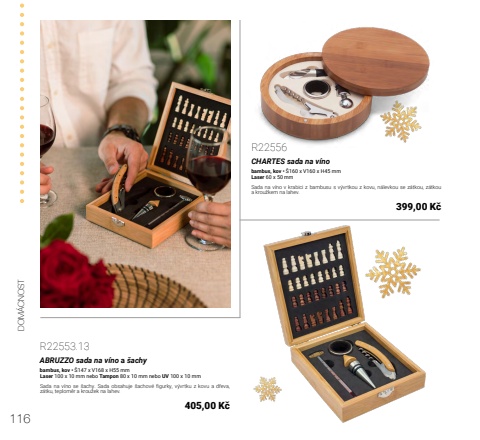 116DOM%u00c1CNOSTR22553.13ABRUZZO sada na v%u00edno a %u0161achybambus, kov %u2022 %u0160147 x V168 x H55 mmLaser 100 x 10 mm nebo Tampon 80 x 10 mm nebo UV 100 x 10 mmSada na v%u00edno se %u0161achy. Sada obsahuje %u0161achov%u00e9 figurky, v%u00fdvrtku z kovu a d%u0159eva, z%u00e1tku, teplom%u011br a krou%u017eek na lahev.405,00 K%u010dR22556CHARTES sada na v%u00ednobambus, kov %u2022 %u0160160 x V160 x H45 mmLaser 60 x 50 mmSada na v%u00edno v krabici z bambusu s v%u00fdvrtkou z kovu, n%u00e1levkou se z%u00e1tkou, z%u00e1tkou a krou%u017ekem na lahev.399,00 K%u010d