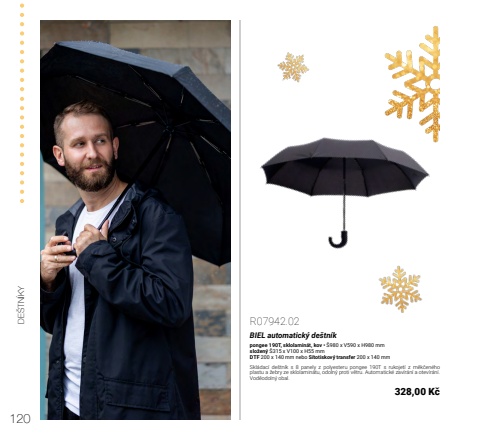 120DE%u0160TN%u00cdKYR07942.02BIEL automatick%u00fd de%u0161tn%u00edkpongee 190T, sklolamin%u00e1t, kov %u2022 %u0160980 x V590 x H980 mmslo%u017een%u00fd %u0160315 x V100 x H55 mmDTF 200 x 140 mm nebo S%u00edtotiskov%u00fd transfer 200 x 140 mmSkl%u00e1dac%u00ed de%u0161tn%u00edk s 8 panely z polyesteru pongee 190T s rukojet%u00ed z m%u011bk%u010den%u00e9ho plastu a %u017eebry ze sklolamin%u00e1tu, odoln%u00fd proti v%u011btru. Automatick%u00e9 zav%u00edr%u00e1n%u00ed a otev%u00edr%u00e1n%u00ed. Vod%u011bodoln%u00fd obal.328,00 K%u010d