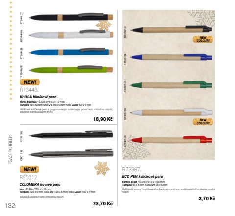 132PSAC%u00cd POT%u0158EBYR73448.02R73387.02 R73448.06 R73387.04 R73448.28 R73387.05 R73448.55 R73387.06 R73387.08 R20012.02 R20012.41NEWCOLOUR!NEWCOLOUR!NEW!R73448..KHOSA hlin%u00edkov%u00e9 perohlin%u00edk, bambus %u2022 %u0160138 x V14 x H10 mmTampon 60 x 6 mm nebo UV 60 x 6 mm nebo Laser 60 x 9 mmHlin%u00edkov%u00e9 kuli%u010dkov%u00e9 pero s pogumovan%u00fdm sat%u00e9nov%u00fdm povrchem a modrou n%u00e1pln%u00ed, zdoben%u00e9 bambusov%u00fdmi prvky.18,90 K%u010dR20012..COLOMERA kovov%u00e9 perokov %u2022 %u0160136 x V13 x H10 mmTampon 100 x 6 mm nebo UV 100 x 6 mm nebo Laser 100 x 9 mmKovov%u00e9 kuli%u010dkov%u00e9 pero s modrou n%u00e1pln%u00ed.23,70 K%u010dR73387..ECO PEN kuli%u010dkov%u00e9 perokarton, plast %u2022 %u0160139 x V10 x H10 mmTampon 90 x 6 mm nebo UV 90 x 6 mmKuli%u010dkov%u00e9 pero z recyklovan%u00e9ho kartonu s prvky z recyklovateln%u00e9ho plastu, modr%u00e1 n%u00e1pl%u0148.3,70 K%u010dNEW!