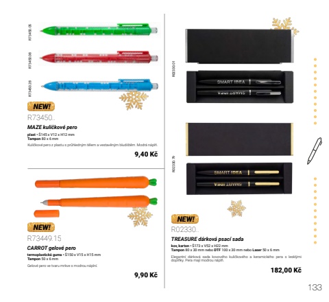 133R73450.05 R73450.08 R73450.28R02330.01 R02330.79NEW!NEW!R73450..MAZE kuli%u010dkov%u00e9 peroplast %u2022 %u0160145 x V12 x H12 mmTampon 80 x 6 mmKuli%u010dkov%u00e9 pero z plastu s pr%u016fhledn%u00fdm t%u011blem a vestav%u011bn%u00fdm bludi%u0161t%u011bm. Modr%u00e1 n%u00e1pl%u0148.9,40 K%u010dR73449.15CARROT gelov%u00e9 perotermoplastick%u00e1 guma %u2022 %u0160150 x V15 x H15 mmTampon 50 x 6 mmGelov%u00e9 pero ve tvaru mrkve s modrou n%u00e1pln%u00ed.9,90 K%u010dR02330..TREASURE d%u00e1rkov%u00e1 psac%u00ed sadakov, karton %u2022 %u0160173 x V52 x H22 mmTampon 80 x 30 mm nebo DTF 100 x 30 mm nebo Laser 50 x 6 mmElegantn%u00ed d%u00e1rkov%u00e1 sada kovov%u00e9ho kuli%u010dkov%u00e9ho a keramick%u00e9ho pera s leskl%u00fdmi dopl%u0148ky. Pera maj%u00ed modrou n%u00e1pl%u0148.182,00 K%u010dNEW!