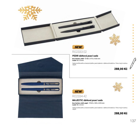 137NEW!NEW!R02333.02PEDRI d%u00e1rkov%u00e1 psac%u00ed sadakov, karton, m%u011b%u010f %u2022 %u0160180 x V75 x H30 mmLaser 45 x 6 mmSada kuli%u010dkov%u00e9ho a keramick%u00e9ho pera balen%u00e1 v d%u00e1rkov%u00e9 krabi%u010dce. Pera maj%u00ed modrou n%u00e1pl%u0148.288,00 K%u010dR02334.42MAJESTIC d%u00e1rkov%u00e1 psac%u00ed sadakov, karton, m%u011b%u010f, pap%u00edr %u2022 %u0160165 x V65 x H25 mmLaser 40 x 6 mmSada kuli%u010dkov%u00e9ho a keramick%u00e9ho pera balen%u00e1 v d%u00e1rkov%u00e9 krabi%u010dce. Pera maj%u00ed modrou n%u00e1pl%u0148.288,00 K%u010d