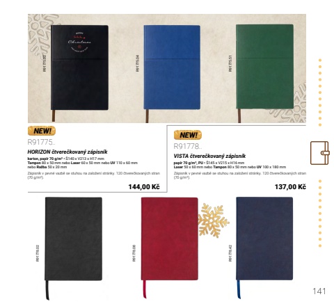 141R91778.02R91775.02 R91775.04 R91775.51 R91778.08 R91778.42NEW! NEW!R91775..HORIZON %u010dtvere%u010dkovan%u00fd z%u00e1pisn%u00edkkarton, pap%u00edr 70 g/m%u00b2 %u2022 %u0160140 x V213 x H17 mmTampon 80 x 50 mm nebo Laser 60 x 50 mm nebo UV 110 x 60 mmnebo Ra%u017eba 50 x 20 mmZ%u00e1pisn%u00edk v pevn%u00e9 vazb%u011b se stuhou na zalo%u017een%u00ed str%u00e1nky. 120 %u010dtvere%u010dkovan%u00fdch stran (70 g/m%u00b2).144,00 K%u010dR91778..VISTA %u010dtvere%u010dkovan%u00fd z%u00e1pisn%u00edkpap%u00edr 70 g/m%u00b2, PU %u2022 %u0160145 x V215 x H16 mmLaser 50 x 60 mm nebo Tampon 80 x 50 mm nebo UV 100 x 180 mmZ%u00e1pisn%u00edk v pevn%u00e9 vazb%u011b se stuhou na zalo%u017een%u00ed str%u00e1nky. 120 %u010dtvere%u010dkovan%u00fdch stran (70 g/m%u00b2).137,00 K%u010d