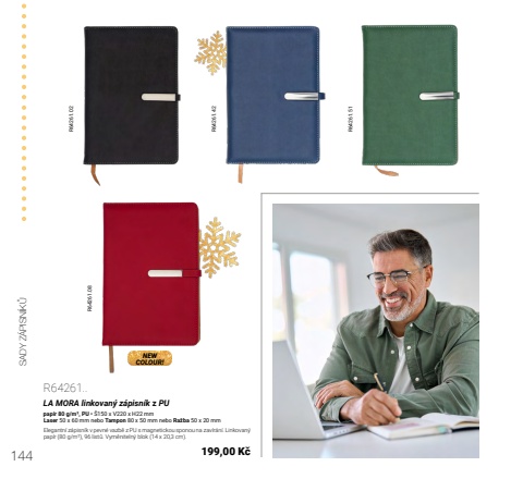 144SADY Z%u00c1PISN%u00cdK%u016eR64261.02 R64261.42 R64261.51 R64261.08R64261..LA MORA linkovan%u00fd z%u00e1pisn%u00edk z PUpap%u00edr 80 g/m%u00b2, PU %u2022 %u0160150 x V220 x H22 mmLaser 50 x 60 mm nebo Tampon 80 x 50 mm nebo Ra%u017eba 50 x 20 mmElegantn%u00ed z%u00e1pisn%u00edk v pevn%u00e9 vazb%u011b z PU s magnetickou sponou na zav%u00edr%u00e1n%u00ed. Linkovan%u00fd pap%u00edr (80 g/m%u00b2), 96 list%u016f. Vym%u011bniteln%u00fd blok (14 x 20,3 cm).199,00 K%u010dNEWCOLOUR!