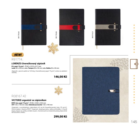 145R91774.04 R91774.08 R91774.21R91774..LORENZO %u010dtvere%u010dkovan%u00fd z%u00e1p%u00edsn%u00edkPU, pap%u00edr 70 g/m%u00b2 %u2022 %u0160145 x V210 x H17 mmLaser 60 x 50 mm nebo Tampon 80 x 50 mm nebo Ra%u017eba 50 x 20 mmZ%u00e1pisn%u00edk v pevn%u00e9 vazb%u011b se 120 listy, %u010dtvere%u010dkovan%u00fd pap%u00edr 70 g/m%u00b2, stuha na zalo%u017een%u00ed str%u00e1nky.146,00 K%u010dR08167.42VICTORIS organiz%u00e9r se z%u00e1pisn%u00edkemRPET, kov, pap%u00edr 70 g/m%u00b2 %u2022 %u0160185 x V230 x H24 mmDTF 120 x 190 mm nebo S%u00edtotiskov%u00fd transfer 120 x 190 mmOrganiz%u00e9r s vym%u011bniteln%u00fdm z%u00e1pisn%u00edkem A5 se 64 %u010dtvere%u010dkovan%u00fdmi listy (70 g/m%u00b2). Pevn%u00e9 desky z tkaniny RPET. Organiz%u00e9r obsahuje jednu velkou p%u0159ihr%u00e1dku, 3 men%u0161%u00ed kapsy, kapsu na vizitky a dr%u017e%u00e1k na pero. Zav%u00edr%u00e1n%u00ed pomoc%u00ed elastick%u00e9 p%u00e1sky p%u0159ipevn%u011bn%u00e9 ke kovov%u00e9mu h%u00e1%u010dku.299,00 K%u010dNEW!