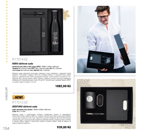 154KANCEL%u00c1%u0158NEW!R17014.02NERO d%u00e1rkov%u00e1 sadanerezov%u00e1 ocel 18/8 a 18/0, pap%u00edr, RPET %u2022 %u0160280 x V300 x H82 mmTampon 80 x 50 mm nebo DTF 100 x 100 mm nebo UV 25 x 120 mmnebo Laser 50 x 60 mm nebo 360 UV 220 x 120 mmD%u00e1rkov%u00e1 sada obsahuj%u00edc%u00ed termosku, z%u00e1pisn%u00edk a pero zabalen%u00e1 v elegantn%u00ed %u010dern%u00e9 krabi%u010dce. Termoska o objemu 500 ml s dvojitou st%u011bnou z nerezov%u00e9 oceli, vnit%u0159n%u00ed st%u011bnou z vylep%u0161en%u00e9 oceli 18/8 a se skl%u00e1dac%u00ed rukojet%u00ed. Termoizola%u010dn%u00ed schopnost 15 h. Z%u00e1pisn%u00edk A5 v pevn%u00e9 vazb%u011b z RPET tkaniny, zdoben%u00fd %u010dern%u00fdm kovov%u00fdm dopl%u0148kem obsahuje 80 %u010dtvere%u010dkovan%u00fdch list%u016f (70 g/m%u00b2). Kovov%u00e9 pero zdoben%u00e9 l%u00e1tkou RPET s modrou n%u00e1pn%u00ed a hrotem 1,0 mm.1082,00 K%u010dR17012.02BEDFORD d%u00e1rkov%u00e1 sadapap%u00edr, keramika, kov, karton %u2022 %u0160345 x V250 x H95 mmLaser 50 x 17 mmD%u00e1rkov%u00e1 sada s keramick%u00fdm hrnkem, kuli%u010dkov%u00fdm perem a z%u00e1pisn%u00edkem. Keramick%u00fd hrnek o objemu 480 ml s matn%u00fdm %u010dern%u00fdm povrchem a kovov%u00fdm pl%u00ed%u0161kem v barv%u011b gun metal; jen ru%u010dn%u00ed myt%u00ed. Z%u00e1pisn%u00edk s pevn%u00fdmi deskami, 80 %u010dtvere%u010dkovan%u00fdch str%u00e1nek (70 g/m%u00b2), kovov%u00fd prvek a p%u00e1ska na zalo%u017een%u00ed str%u00e1nky. Kuli%u010dkov%u00e9 pero z hlin%u00edku s %u010dern%u00fdm t%u011blem, klipem v barv%u011b gun metal a modrou n%u00e1pln%u00ed. Sada je balena ve stylov%u00e9 d%u00e1rkov%u00e9 krabi%u010dce.939,00 K%u010d