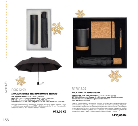 156KANCEL%u00c1%u0158R17013.02ROCKEFELLER d%u00e1rkov%u00e1 sadanerezov%u00e1 ocel 18/8, korek, pap%u00edr, RPET %u2022 %u0160335 x V305 x H100 mmDTF 180 x 100 mm nebo Tampon 50 x 80 mm nebo Laser 50 x 60 mm neboUV 100 x 50 mm nebo S%u00edtotiskov%u00fd transfer 50 x 120 mmnebo 360 UV 276 x 30 mmD%u00e1rkov%u00e1 sada obsahuj%u00edc%u00ed termohrnek, de%u0161tn%u00edk, z%u00e1pisn%u00edk a pero zabalen%u00e1 v elegantn%u00ed %u010dern%u00e9 krabi%u010dce. Z%u00e1pisn%u00edk A5 v pevn%u00e9 vazb%u011b s 80 %u010dtvere%u010dkovan%u00fdmi listy (70 g/m%u00b2). Termohrnek o objemu 350 ml vyroben%u00fd z recyklovan%u00e9 nerezov%u00e9 oceli s pr%u016fhledn%u00fdm v%u00ed%u010dkem, korkov%u00fdm dnem a %u010dern%u00fdm matn%u00fdm povrchem. De%u0161tn%u00edk s korkovou rukojet%u00ed ve vod%u011bodoln%u00e9m obalu vyroben%u00fd z RPET pongee 190T, %u017eebra de%u0161tn%u00edku vyroben%u00e1 ze sklolamin%u00e1tu. Pero s t%u011blem z korku, modrou n%u00e1pln%u00ed a hrotem 1,0 mm.1435,00 K%u010dR08242.99MONACO d%u00e1rkov%u00e1 sada termohrnku a de%u0161tn%u00edkuocel, polyester, karton %u2022 %u0160190 x V320 x H80 mmhrnek %u016065 x V275 x H65 mm, de%u0161tn%u00edk %u0160980 x V550 x H980 mmDTF 150 x 90 mm nebo S%u00edtotiskov%u00fd transfer 150 x 90 mmnebo Laser 50 x 60 mm nebo Tampon 30 x 80 mm nebo 360 UV 205 x 200 mmD%u00e1rkov%u00e1 sada obsahuj%u00edc%u00ed termohrnek o objemu 450 ml s dv%u011bma st%u011bnami z oceli a vnit%u0159n%u00ed st%u011bnou z vylep%u0161en%u00e9 oceli 18/8 a de%u0161tn%u00edk o pr%u016fm%u011bru 98 cm. Termoizola%u010dn%u00ed schopnost hrnku je 16 h. Baleno v d%u00e1rkov%u00e9 krabi%u010dce.973,00 K%u010d